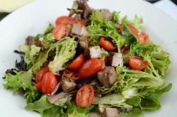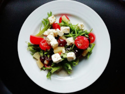Tomate Cereja, azeitonas pretas, e queijo, bastante queijo.